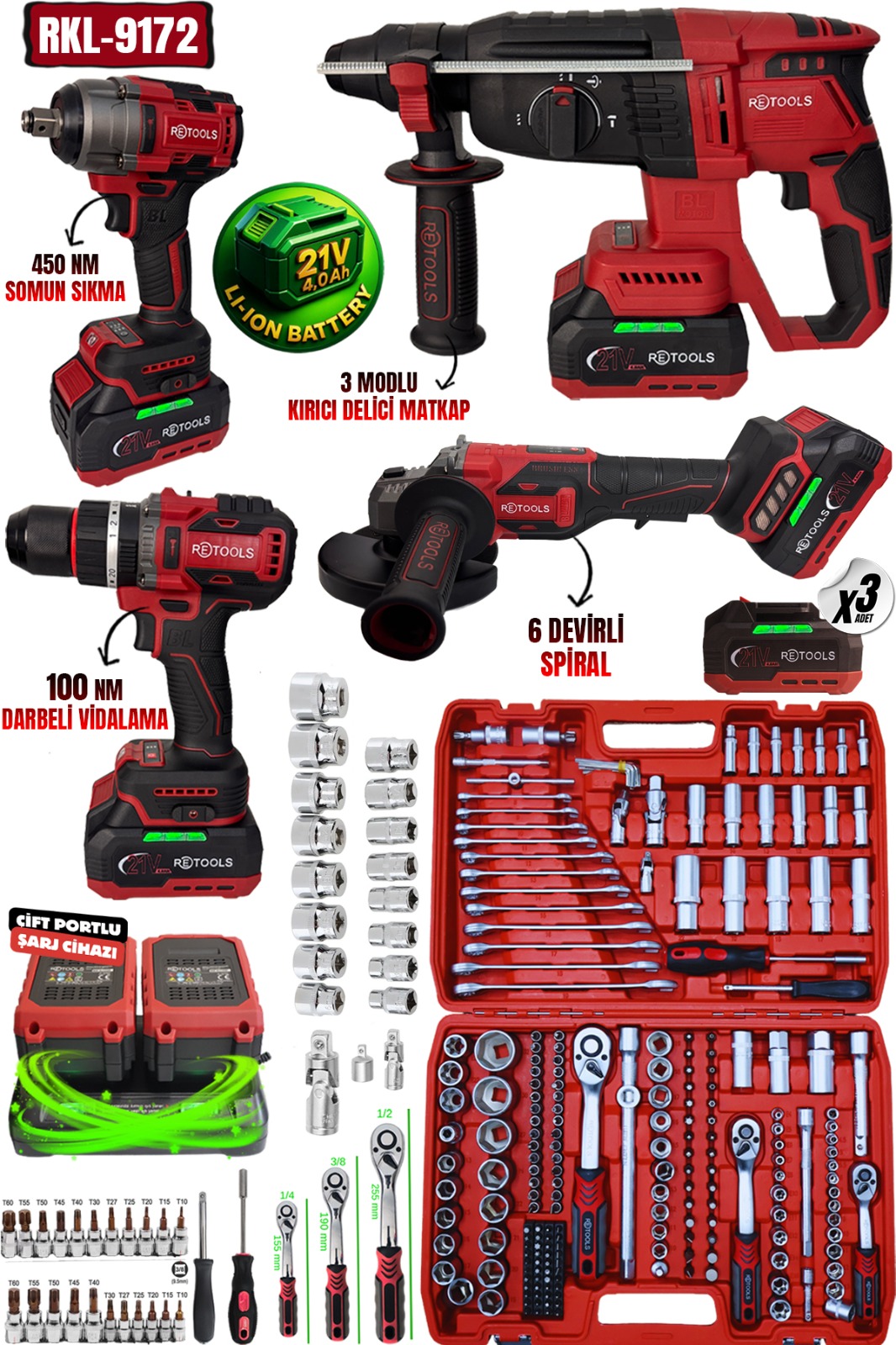 Profesyonel kullanım ve ev tipi tamirat işleri için geliştirilen RKL-9172 RETOOLS BORDO 5 LI SET ( 4 LÜ SET + 216 PARÇA LOKMA TAKIMI ), güçlü makineleri ve zengin aksesuar içeriğiyle delme, kırma, kesme, vidalama ve somun sökme işlemlerinde eksiksiz çözüm sunar. Yüksek tork değerleri, dayanıklı motor yapısı ve ergonomik tasarımı sayesinde hem ustalar hem de hobi kullanıcıları için pratik ve uzun ömürlü kullanım sağlar.